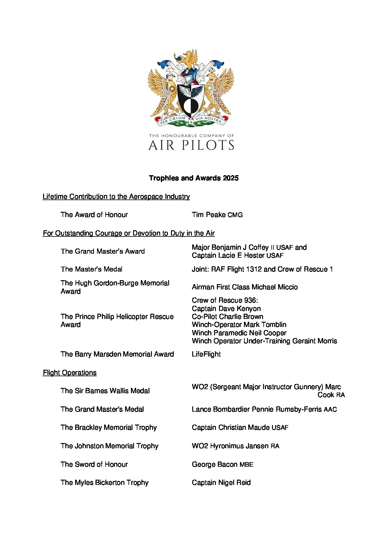To promote excellence and recognise commendable achievement in aviation, the Air Pilots presents trophies and other awards for outstanding performance by individuals or organisations. The prestigious Trophies and Awards Banquet takes place annually in Guildhall in October.